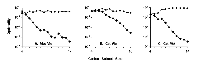 Fig. 4. Size Law for cortex areas. In each case, a series of nested compact subsets of the set of cortical areas was generated, each consisting of from 4 to the full set of areas. Each subset of the actual layout was compared with all possible alternative layouts of that subset for optimality; optimality-measure is conformance of the system to the adjacency rule (2). (16 and 17-element sets were each compared only with random samples of 109 alternative layouts.) (A) The system of components is 17 contiguous macaque visual cortex areas as in Fig. 3, with connections and adjacencies as in Table 1, and order of successive elements added as in Table 1. (B) Similar analysis for 15 cat visual cortex areas. (C) 14 cat cortex "metamodules" composed from 40 Brodmann areas of visual, auditory, and somatosensory regions. (See Figs. S3, S5, S6.)