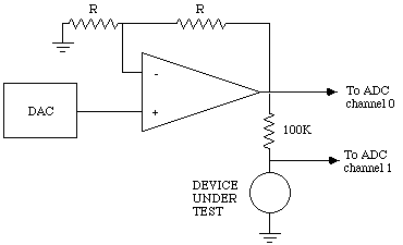 output of the DAC to 10 volts and applies it to the Device Under Test through a