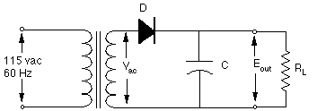 1. Set up the following circuit, where the transformer is a 6-8 volt power transformer, the diode D is a rectifier diode and the resistor RL is a 1 KOhm, 1/2 watt resistor. Plug the transformer's primary winding into the 115 vac power. At first, leave out the filter capacitor C.