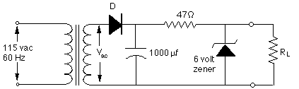 1. Add the following Zener voltage regulator to the output of your power supply. Initially, make the load resistance RL 1000 Ohms .