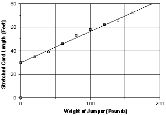 (e) As a follow-up study, design and conduct a scale model test to find the likely relation between cord length and stretch length for some fixed amount of weight. Prepare a report that you believe would convey the findings clearly to planners of a jump.