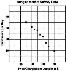 7. The following graph shows data from a market research survey of potential bungee jump customers. People were asked how much they would pay to take a jump. Based on those results, the survey company predicted likely numbers of customers each day at several typical prices.