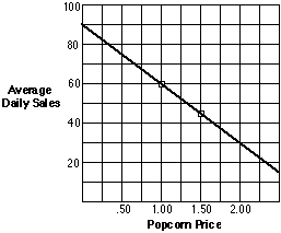 One week she set the price for popcorn at $1.00 and sold an average of 60 tubs per night. The next week she set the price at $1.50 and sold an average of 45 tubs per night. She made a linear graph model to predict sales at other possible prices.