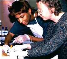 Intern Marshell Kinnel of Bowie State University spent her summer verifying that the antibiotic gentamicin is toxic to a very specific region in the kidneys of toadfish. This confirmation is important for aquatic toxicologists and veterinarians such as Marshell's mentor at the University of Maryland School of Medicine, Dr. Renate Reimshuessel. Marshell's work is an outgrowth of Dr. Reimshuessel's discovery that certain fish can regenerate kidney tissue following exposure to toxic substances. The next step was to find out how fish with different kidney anatomy would respond. With Dr. Reimschuessel's guidance, Marshell learned how to administer gentamicin to toadfish via injections and to evaluate the extent of the kidney damage. She also helped to revise the manuscript that will be submitted to a scientific journal, and earned a name mention on the article.