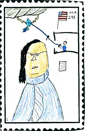 My stamp commemorates Benjamin Franklin. The colors I'll be using is blue, white, brown, red, black and peach. In the background some of the symbols are a kite, key, and a flag. It is a stormy day she he can do the experiment.