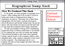 We had just finished working with a multimedia hypercard stack on Native Americans so we decided to try making this one with our essays and stamps. The pictures included in this stack were captured using a special board in the computer called a video digitizer and a video camera connected to this board in the computer. This attachment allows us to capture still and moving images and place them into any document.