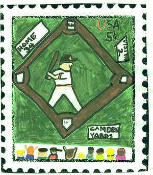My commemorative stamp shows Cal Ripken Jr. playing baseball at Camden Yards, in Baltimorem, Maryland. I made Camden Yards the setting because that is where he plays most of his games. He is up to bat. The crowd is watching and cheering him on. The main colors are orange, black, brown, green and white. The Oriole's team colors are orange, white and black. The score on the score board is 34 to 2. Baltimore is wining by 32 points!