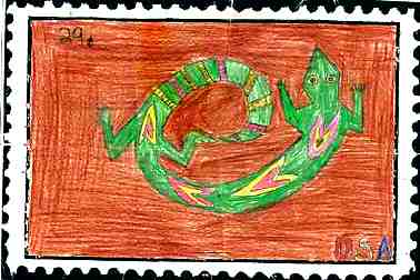 My stamp commemorates a lizard from the Southwest Indians. This lizard has hearts on its back. The first heart has 2 hearts in 1. It also has stripes on its tail. The lizard is green, red, orange, and yellow. The Southwest Indians got these colors from nature. They painted lizards and other animals in pottery.