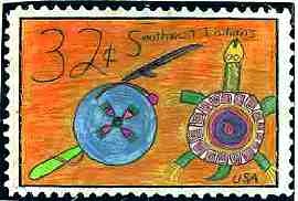 My stamp shows a corn plower, which the farmers of the Southwest Indian tribe used to plant the corn. It is made out of a clay-like material. On the bottom left there is a gourd rattle that the Southwest Indians used in ceremonies that they held. The gourd rattles make music. The colors in the gourd rattle are made from flowers. Then on the bottom right there is a turtle design that the Southwest Indians used for designing pottery and other things like that. The colors I used come from nature.