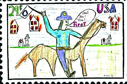My stamp commemorates James Madison. It shows James giving orders to his men in the War for Independence. He is holding the American flag representing freedom for Americans. The background shows canons firing and houses burning because the British burnt down Washington and Baltimore. James Madison is saying, "One, Two, Three, FIRE." because he is giving orders to his men.