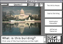 This is one example of a series of experimental Hypercard stacks that we developed to be used by students for practicing taking tests. This one is a based on the standard four-answer multiple choice quiz, in which the student is given a question and is to click on the correct answer. The stack gives immediate feedback (graphic and/or audio), keeps score, and allows the student to clear the score and start over. In this variation of the multiple choice quiz stack, a graphic accompanies the question.