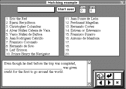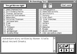 This is one example of a series of experimental Hypercard stacks that we developed to be used by students for practicing taking tests. This one is a "word matching" quiz, in which the student is given a definition or question and is to click on the matching word or phrase in the list. The stack gives immediate feedback (graphic and/or audio), keeps score, and allows the student to clear the score and start over.