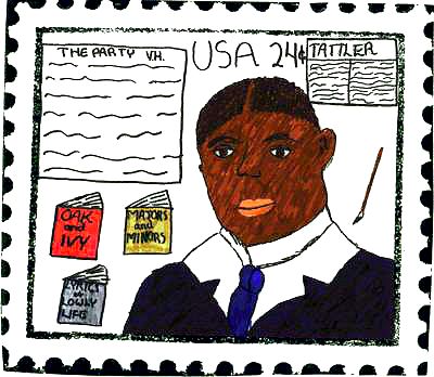 This commemorative stamp has one of my most favorite poems of his on it "The Party." It is about him going to a party and telling about what happens during it. What they ate, how they looked, and how much fun they had. The peacock blue calligraphy pen is there because a poet always needs to use a pen for writing his rough drafts and final copies of his poems. This stamp includes Majors and Minors, Oak And Ivy, and Lyrics of Lowly Life. It has his newspaper too, "The Tattler." It also includes his novel The Uncalled. In the drawing of him he is in a black suit with a blue tie.