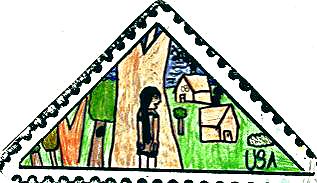This stamp commemorates Pocahontas. On my stamp I drew a picture of Pocahontas looking very surprised at seeing the Englishmen building their houses! In the book Pocahontas couldn't even belive her eyes there were so many houses! She ran all the way back to her village just to tell them that the Englishmen were in very near to them. I used an outside setting because it would look very weird if I showed her infront of a business building. The Englishmen had houses that Pocahontas had never seen before.