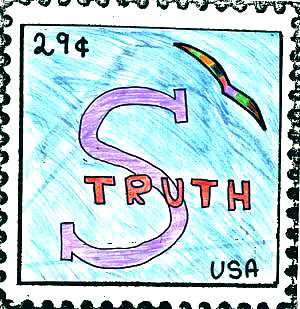This stamp commemorates Sojourner Truth. When she was little and even when she was grown up she loved to stop and watch the birds fly and sometimes she imagined that the birds were in different colors of the rainbow or just multi-colored. The location of this stamp is in the sky. The setting, location, and scene of the stamp is in the morning, in the sky and on a clear day. The colors on my stamp are a blue background, orange and purple letters and a multi-colored bird or condor. The symbols on my stamp are a big S the word TRUTH and a multi-colored condor. The big S stands for her first name Sojourner and the word truth is her last name and the multi-colored condor stands for the birds she loved to watch from when she was little until the end of her life. It also stands for her ideas because they embraced universal freedom. The ideas behind this stamp was to present something which represents simple, direct, but attractive truth.