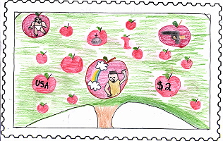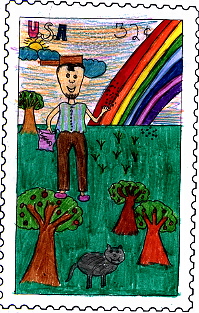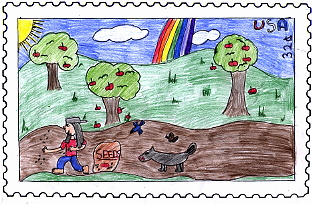 On my stamp there is Johnny Appleseed planting seeds. The trees