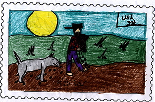 My stamp shows Johnny Appleseed planting appleseeds with brother wolf