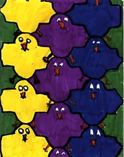 I just colored the shapes in and they looked like chicks, so I added beaks, eyes, and feet.