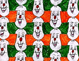 The clown with a cheezy smile has many wigs, considering he is a disembodied head with stuffed puppets of himself all around him. He is the perfect head. Can you find him?