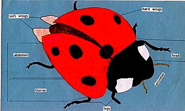 The ladybug is a beetle. The ladybug has six legs, two eyes, and two feelers. Ladybugs can be yellow, orange, or red with black spots. They have a pair of hard wings and a pair of soft wings.
