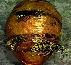 HORNETS ARE SOCIAL WASPS. THE HORNET THAT THERE ARE THE MOST OF IN UNITED STATES IS THE BOLD FACED HORNET. IT HAS A BLACK AND WHITE BODY WITH A WHITE FACE. THEIR NESTS ARE HANGING. THEY CAN BE FOUND ON TREES AND BUSHES. THE NEST CAN GROW AS BIG AS A BASKETBALL AND HAVE 100 ADULT HORNETS. HORNETS WERE SOME OF THE FIRST PAPERMAKERS.THEY USE CHEWED UP PLANT AND WOOD TO MAKE LARGE PAPER NESTS. IN SPRING THE QUEEN FEMALE MAKES THE NESTS. THE LITTLE HORNETS THAT ARE BORN FIRST HELP THEIR MOTHER MAKE THE NEST LARGER. HORNETS LIVE IN THEIR NEST FOR ONE YEAR. THE NEST WORKERS AND THE MALES DIE WITH THE FIRST FROST OF WINTER. HORNETS WILL STING YOU IF YOU BOTHER THEM . IF THEY STING YOU IT WILL HURT AND GET SWOLLEN. HORNETS HELP BY EATING FLYS THAT THEY EAT. SEE YOU IN THE SPRING