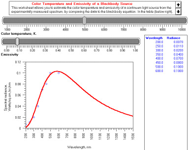 This model can be used to determine whether a light source has a blackbody-like emission spectrum and to estimate its temperature and emissivity if so. Students take experimental measurements of the radiance of a light source at various wavelengths, type in the values of wavelength and radiance into the table on the right, then adjust the parameters of the model (temperature and emissivity) so that the calculated blackbody spectrum (shown by the red line) is a best fit to the experimental data points (shown by the blue dots). For the greatest accuracy, the spectrum must be recorded on an instrument that is corrected for the wavelength-dependence of the detector sensitivity.