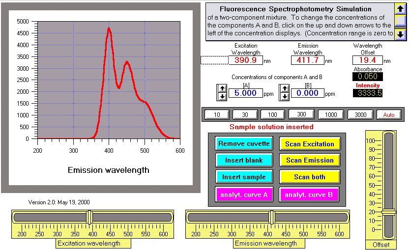 spectrofluorometer. The simulation displays graphs of the excitation