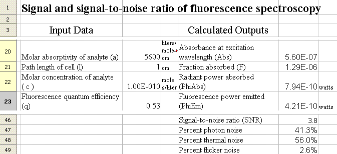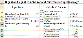 Computes the theoretical signal-to-noise ratio for a fluorescence specrometer with a continuum source (e.g. Xenon arc lamp) modeled as a blackbody, dispersive emission and excitation monochromators, and a photomultiplier detector, given the molar absorptivity and fluorescence quantum yield of the analyte at the excitation wavelength. Note that this simulation predicts only a theoretical maximum signal-to-noise ratio limited by detector noise and by the photon noise of the analyte's fluorescence emission. In practice, the measurement of small fluorescence intensities is likely to be limited by photon noise from spectral interferences, background fluorescence from the solvent, or the contamination on the sample cuvette. Even if the systematic error caused by background fluorescence interference is eliminated or compensated (for example by using synchronous scanning, wavelength modulation, derivative spectroscopy, or advanced chemometric techniques such as rank annihilation), the photon noise from the background remains and sets an ultimate limit to signal-to-noise ratio performance.