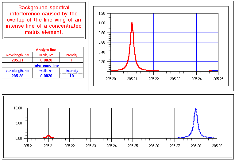This worksheet has only one simple purpose: to demonstrate graphically how the Lorentzian line wings of an intense matrix line can cause a background spectral interference even if the analyte line is many line-widths away from the interfering matrix line. (Because this simulation deals with spectral effects far from the line center of the interfering line, it does not include the effects of Doppler broadening or of instrumental broadening due to non-zero spectral bandpass). Note: The effect of continuum background emission is commonly compensated by using a wavelength modulation system or photodiode array detector with appropriate software.