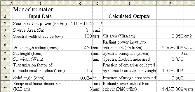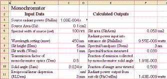 Computes the radiant power exiting from the exit slit of a monochromator, given the radiant power incident on the entrance slit and the optical characteristics of the monochromator.