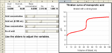 A model of the titration curve of a weak monoprotic acid titrated by a strong base. You can change the acid concentration, acid volume, base concentrations, and Ka of the acid by using the sliders. You can even change the Kw of water in cell E2. Assumptions: Activity effects are ignored. The pH is measured correctly without error at the ends of the pH range.