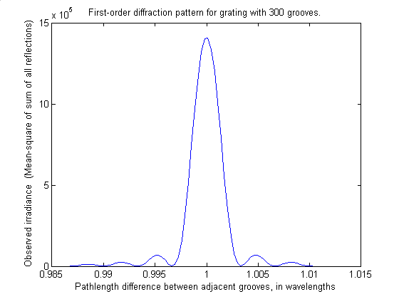 | Close-up of first-order diffraction pattern of grating illuminated by monochromatic light. Shows the "diffraction limit' caused by the finite number of grooves, N. The larger N, the narrower this pattern, and the higher the diffraction-limited resolution of the grating. The width of the maximum is inversly proportional to the number of grooves N. In this figure, the number of grooves N is 300. A real, practical spectrometer can not achieve this so-called diffraction-limited resolution because it must utilize a finite slit width in order to allow sufficient light to enter the detector. As the slit with approaches zero, the effective resolution approaches the diffraction limit illustrated here, but the intensity of the light reaching the detector approaches zero. Click DiffractionGratingFirstOrder.m to view code or right-click and select "Save link as..." to download the m-file. |