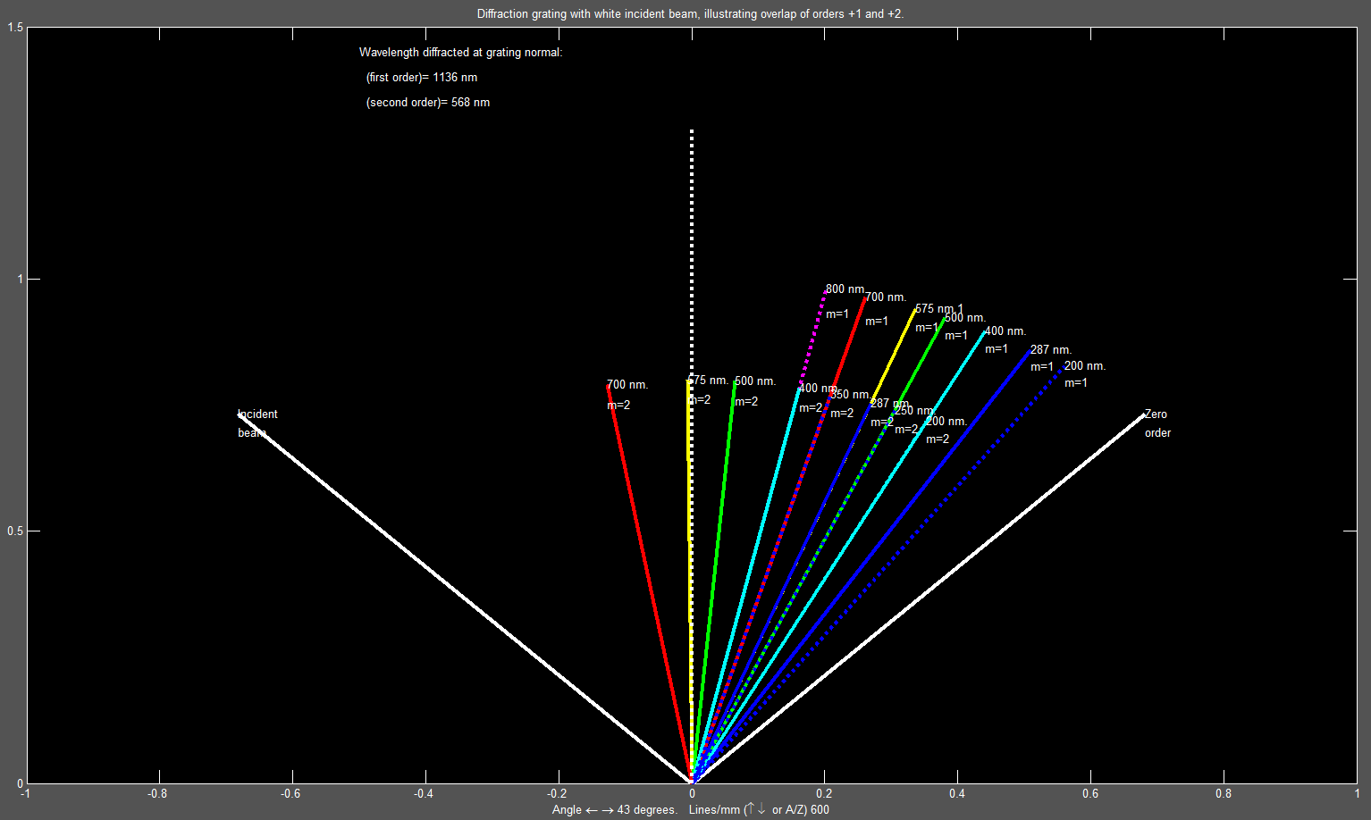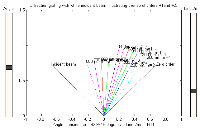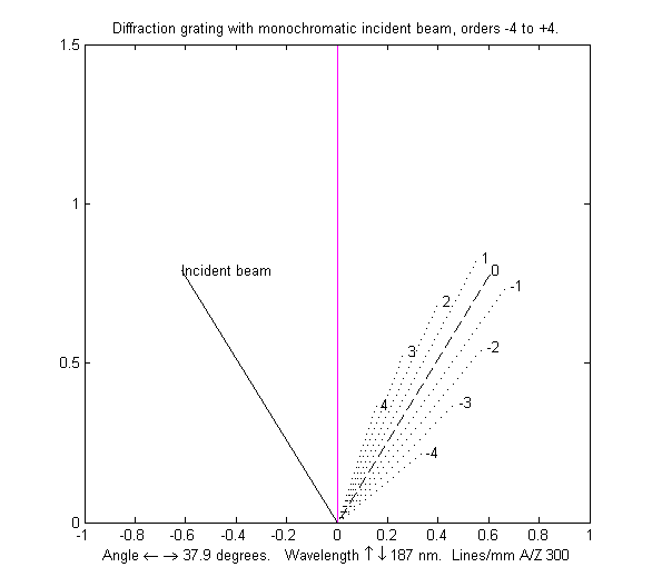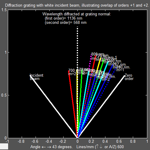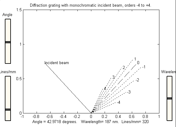 reflection from the grating surface. The left and right cursor arrow keys control the angle of incidence, the up and down cursor arrow keys (or the A and Z keys) control the grating ruling density (lines/mm). The diffracted beam labels will be clearer if the figure window is enlarged or zoomed to full-screen. Click whitegrating.m to view code or right-click and select "Save link as..." to download the m-file. Keyboard commands: Angle of incidence, degrees...left and right cursor arrows Ruling density, lines/mm......A/Z or up and down cursor arrows |