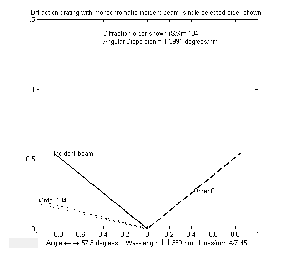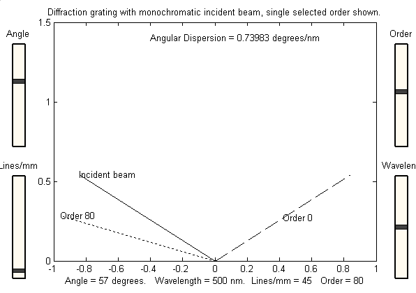 and decrease the diffraction order shown. Click ordergrating.m to view code or right-click and select "Save link as..." to download the m-file. The figure on the left illustrates the operation of an echelle grating, a coarsely-ruled grating that acheives high dispersion by being operated at high diffraction orders and large angles of incidence and diffraction. Keyboard commands: Angle of incidence, degrees...left and right cursor arrows Wavelength, nm................up and down cursor arrows Ruling density, lines/mm......A/Z Diffraction order.............S/X |