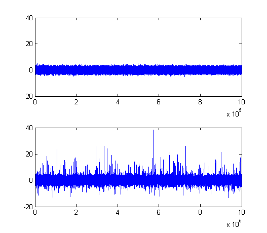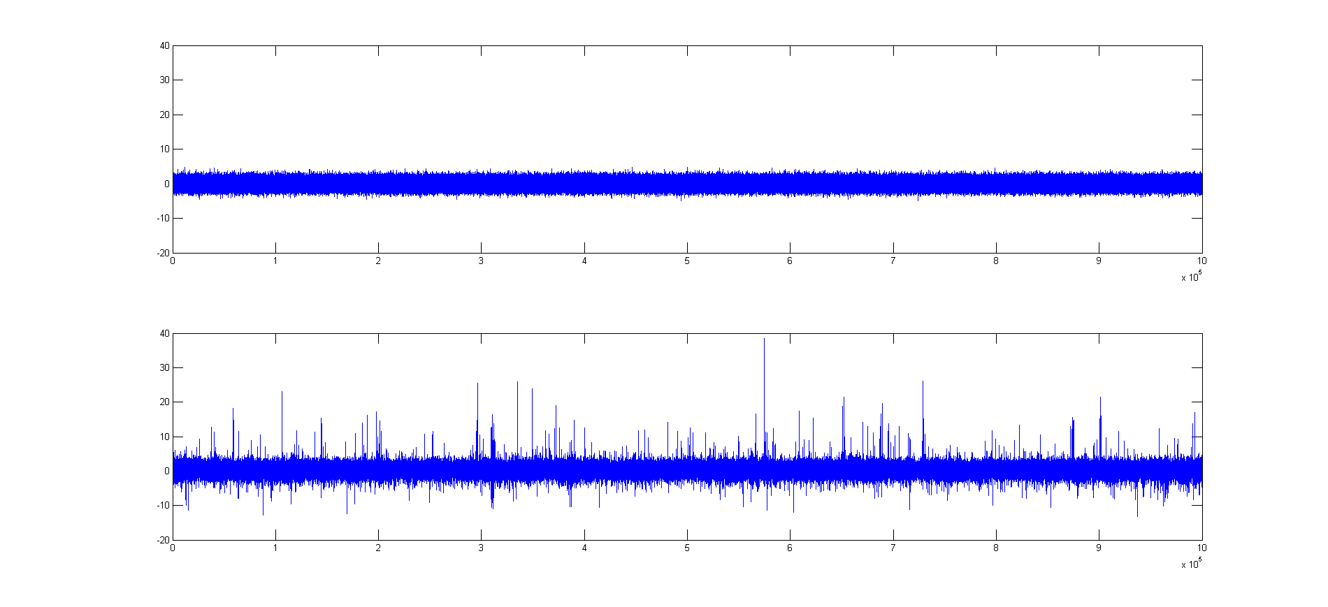 This experimental signal in this case study was unusual because it did not look like a typical signal when plotted; in fact, it looked a lot like noise at first glance. The figure below compares the raw signal (bottom) with the same number of points of normally-distributed white noise (top) with a mean of zero and a standard deviation of 1.0 (obtained from the Matlab/Octave 'randn' function).