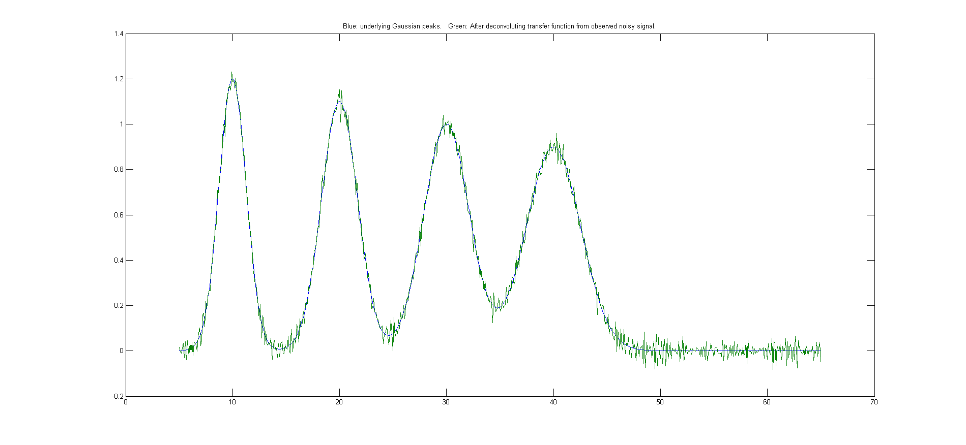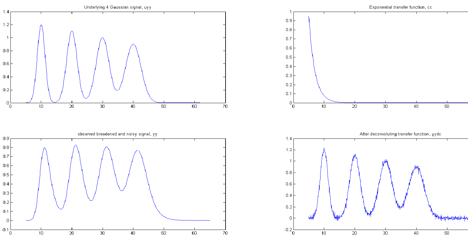 In the script shown below and the resulting graphic shown on the right (Download this script), the underlying signal (uyy) is a set of four Gaussians with peak heights of 1.2, 1.1, 1, 0.9 located at x=10, 20, 30, 40 and peak widths of 3, 4, 5, 6, but in the observed signal (yy) these peaks are broadened exponentially by the exponential function cc, resulting in shifted, shorter, and wider peaks, and then a little constant white noise is added after the broadening. The deconvolution of cc from yy successfully removes the broadening (yydc), but at the expense of a substantial noise increase. However, the extra noise in the deconvoluted signal is high-frequency weighted ("blue") and so is easily reduced by smoothing and has less effect on least-square fits than does white noise. (For a greater challenge, try adding more noise in line 6 or use a bad estimate of time constant in line 10). To plot the recovered signal overlaid with underlying signal: plot(xx,uyy,xx,yydc). To plot the observed signal overlaid with the underlying signal: plot(xx,uyy,xx,yy). Excellent values for the original underlying peak positions, heights, and widths can be obtained by curve-fitting the recovered signal to four Gaussians: [FitResults,FitError]= peakfit([xx;yydc],26,42,4,1,0,10). With ten times the previous noise level (Noise=.01), the values of peak parameters determined by curve fitting are still quite good, and even with 100x more noise (Noise=.1) the peak parameters are more accurate than you might expect for that amount of noise (because that noise is blue). Visually, the noise is so great that the situation looks hopeless, but the curve-fitting actually works pretty well.