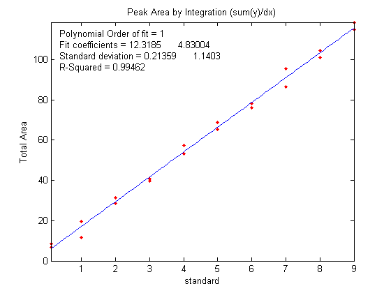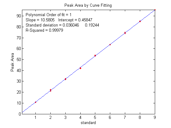 plots should ideally have an intercept of zero and an R2 of 1.000, but the slope is greater for the peak area measurements