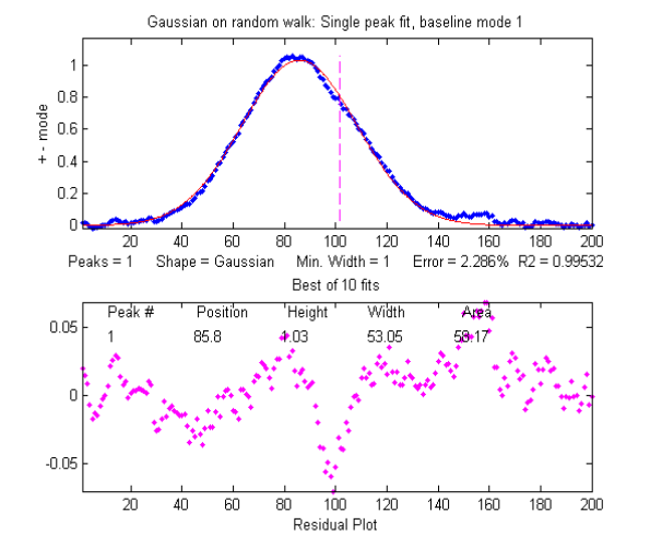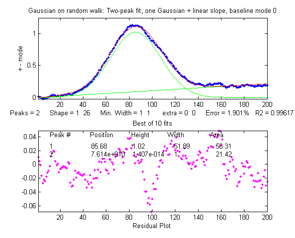 To demonstrate the measurement difficulties, the script RandomWalkBaseline.m simulates a Gaussian peak with randomly variable position and width, on a random walk baseline, with a S/N ratio is 15. The peak is measured by least-squares curve fitting methods using peakfit.m with two different methods of baseline correction in an attempt to handle the random walk: