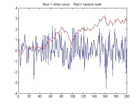 Random walks describe and serve as a model for many kinds of unstable behavior. Whereas white, 1/f, and blue noises are anchored to a mean value to which they tend to return, random walks tend to be more aimless and often drift off on one or another direction, possibly never to return. Mathematically, a random walk can be modeled as the cumulative sum of some random process, for example the 'randn' function. The graph on the right compares a 200-point sample of white noise (computed as 'randn' and shown in