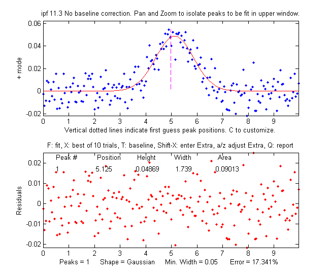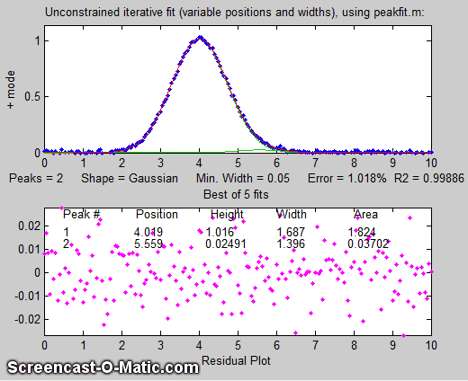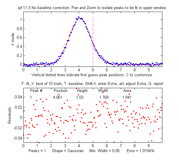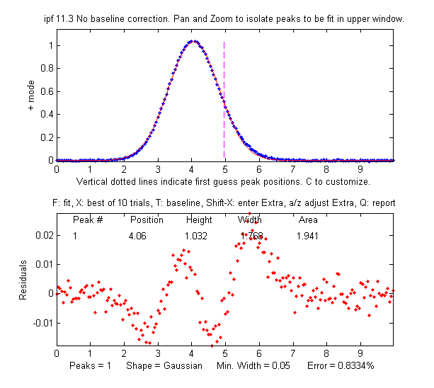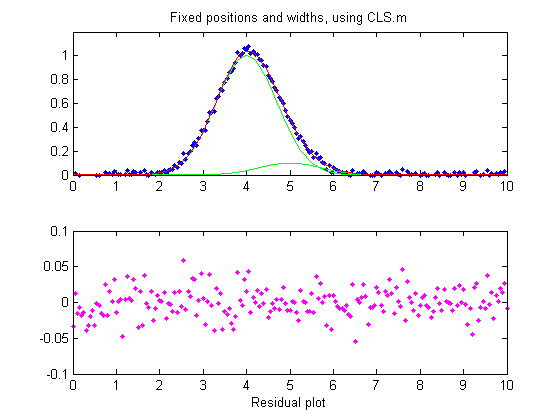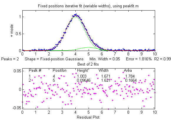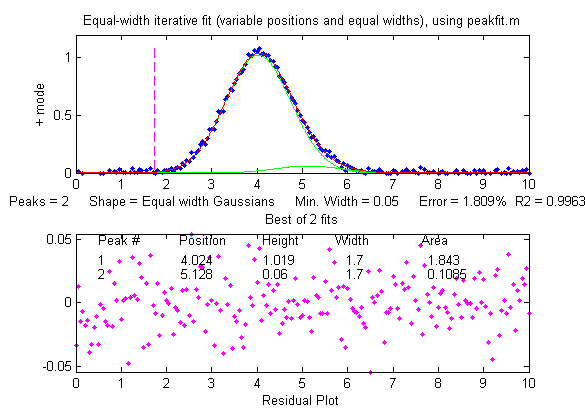 But with a greater x-axis shift (xshift=1.0) even the equal-width fit has trouble. Still, if we know the separation between the two peaks, it's possible to use the findpeaksG function to search for and locate the larger peak and to calculate the position of the smaller one. Then the CLS method, with the peak positions so determined for each separate signal, shown in Figure window 5 and labeled "findpeaksP" in the table below, works better. Alternatively, another way to use the findpeaks results is a variation of the equal-width iterative fitting method in which the first guess peak positions (line 82) are derived from the findpeaks results, shown in Figure window 6 and labeled "findpeaksP2" in the table below; that method does not depend on accurate knowledge of the peak widths, only their equality.