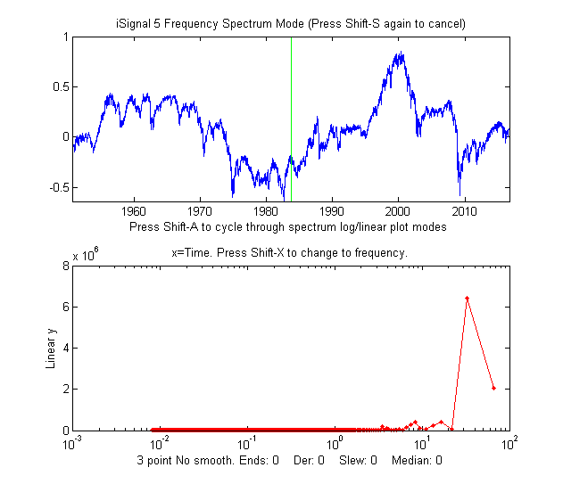 (lower panel, in red) shows peaks at 33, 16, 8, and 4 years.