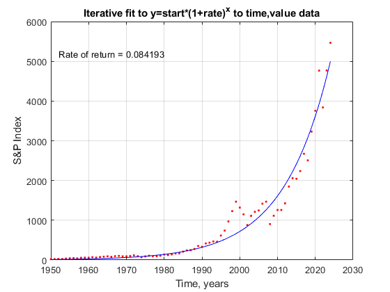 where V is the value, S is the starting value, R is the annual rate of return, and T is time. By itself, this expression would yield a smooth curve, without all the peaks and dips. The values of S and R that result in the best fit to the stock market data (shown by the blue lines in the graphs) can be determined in two ways: