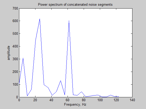 using the PlotFrequencySpectrum function, or you could have used iSignal in the frequency spectrum mode (Shift-S). The spectrum of the noise shows a strong component very near 60 Hz, which is almost certainly due to power line pickup (the recording was made in the USA, where AC power is 60Hz); this suggests that better shielding and grounding of the electronics might help to clean up future recordings. The lack of strong components at 100 Hz and above suggests that the vocal sounds have been effectively suppressed at this threshold setting. The script can be applied to other sound recordings in WAV format simply by changing the file name and time axis in lines 8 and 9.