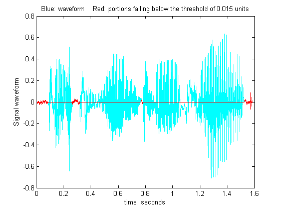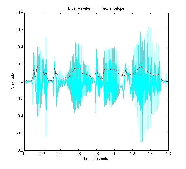 With periodic signal waveforms the situation is a bit more complicated. As an example, consider the audio recording of the spoken phrase "Testing, one, two, three" (click to download in .mat format or in WAV format) that was used previously. The Matlab/Octave script PeriodicSignalSNR.m loads the audio file into a variable "waveform", then computes the average amplitude of the waveform (the "envelope") by smoothing the absolute value of the waveform: