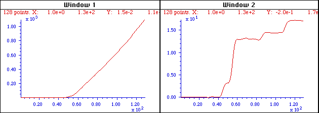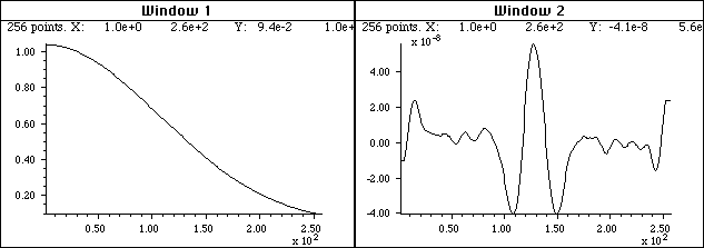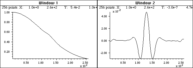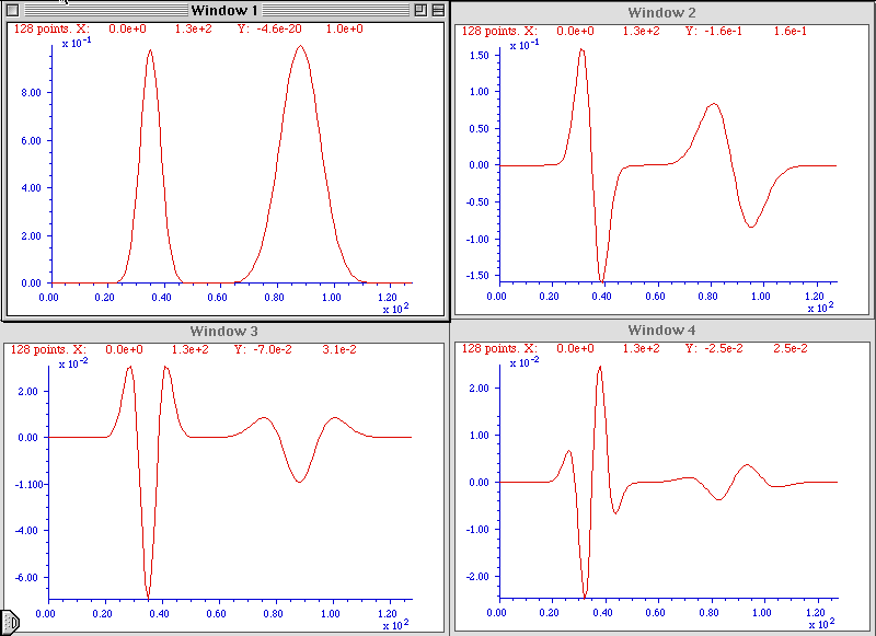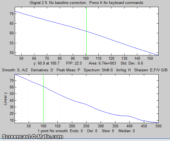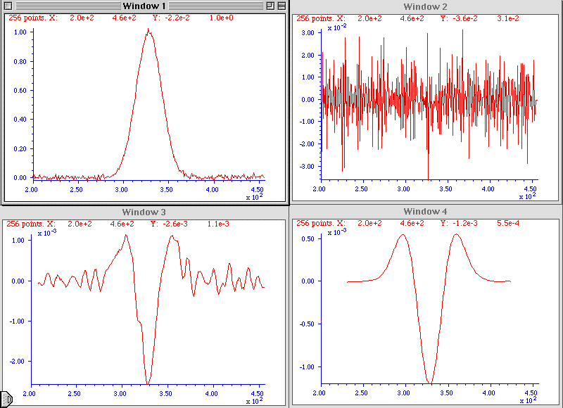 vector, correcting for non-uniform x-axis intervals). These statements generate the 4th derivative of a Gaussian peak and display it in iSignal. You'll need to download isignal.m, gaussian.m, and deriv4.m. >> x=[1:.1:300]'; >> isignal(x,deriv4(100000.*gaussian(x,150,50)+.1*randn(size(x)))); The signal is mostly blue noise (because of the differentiated white noise) unless you smooth it considerately. Use the A and Z keys to increase and decrease the smooth width and the S key to cycle through the available smooth types. Hint: use the Gaussian smooth and keep increasing the smooth width. The script "iSignalDeltaTest" demonstrates the frequency response of the smoothing and differentiation functions of iSignal by a applying them to a delta function. Change the smooth type, smooth width, and derivative order and see how the power spectrum changes. Real-time