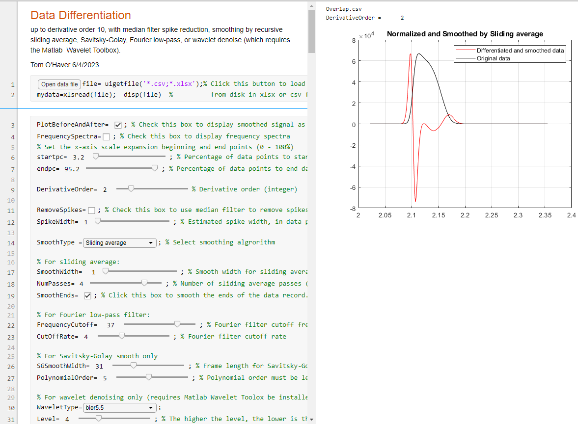 differentiation in Matlab is discussed in Appendix Y DataDifferentiation.mlx is a Live Script for differentiation and smoothing applied to experimental data stored on disk. It is a variant of DataSmoothing.mlx discussed in the previous chapter, with the addition of a slider (in line 9) to select the derivative order (up to 10). The startpc and endpc sliders in lines 6 and 7 allow you to select which portion of the data range to display, from 0% to 100% of the total range of the data file. The other controls all relate to smoothing, which is especially important to improve the signal-to-noise ratio in differentiation. The smooth width (line 17) and the number of passes (line 18) are important. The general rule is: for the nth derivative, set the number of passes to at least n+1. Note: If the "PlotBeforeAndAfter" check box is checked, the derivative (red curve) will be scaled to match the maximum of the original signal (black curve). If that box is not checked, the derivative will be displayed by itself with its actual amplitude. (This is done because the numerical amplitudes of derivative is often orders of magnitude different than the original signals).