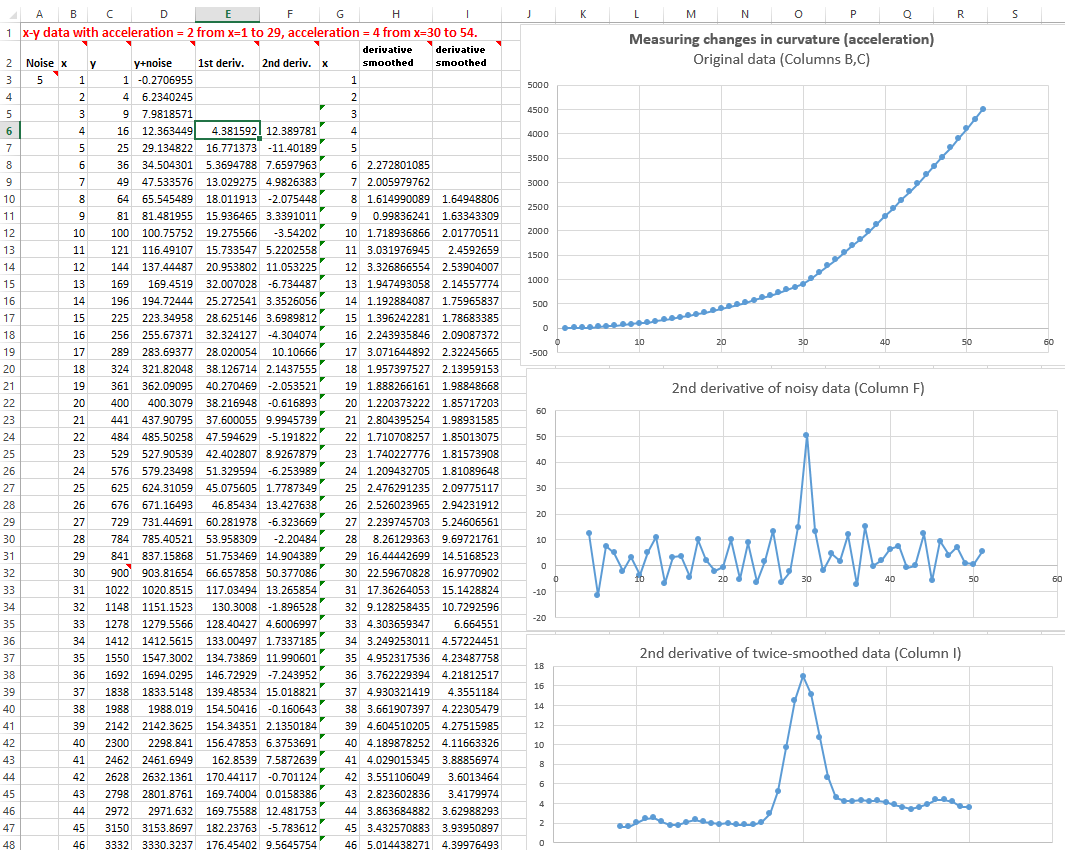 Another example of a derivative application is the spreadsheet SecondDerivativeXY2.xlsx (graphic), which demonstrates locating and measuring changes in the second derivative (a measure of curvature or acceleration) of a time-changing signal. This spreadsheet shows the apparent increase in noise caused by differentiation and the extent to which the noise can be reduced by smoothing (in this case by two passes of a 5-point triangular smooth). The smoothed second derivative shows a large peak the point at which the acceleration changes (at x=30) and plateaus on either side showing the magnitude of the acceleration before and after the change (y=2 and 4, respectively).