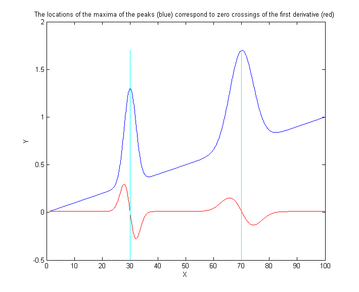or before differentiation. Smoothed derivatives. Since smoothing almost always goes along with differentiation, the function SmoothDerivative.m combines the two. The syntax is function Processed=SmoothedDerivative(x, y, DerivativeOrder, w, type, ends) where 'DerivativeOrder' determines the derivative order (0, 1, 2, 3, 4, 5), 'w' is the smooth width, 'type' determines the smooth mode: If type=0, the signal is not smoothed. If type=1, rectangular (sliding-average or boxcar) If type=2, triangular (2 passes of sliding-average) If type=3, pseudo-Gaussian (3 passes of sliding-average) If type=4, Savitzky-Golay smooth and 'ends' controls how the "ends" of the signal (the first w/2 points and the last w/2 points) are handled If ends=0, the ends are zeroed If ends=1, the ends are smoothed with progressively smaller smooths the closer to the end. Peak detection. The simplest code to find peaks in x,y data sets simply looks for every y value that has lower y values on both sides (allpeaks.m). A alternative approach is to use the first derivative to find all the maxima by locating the points of zero-crossing, that is, the points at which the first derivative "d" (computed by derivxy.m) passes from positive to negative. In this example, the "sign" function is a built-in function that returns 1 if the element is greater than zero, 0 if it equals zero and -1 if it is less than zero. The routine prints out the value of x and y at each zero-crossing: d=derivxy(x,y); for j=1:length(x)-1 if sign(d(j))>sign(d(j+1)) disp([x(j) y(j)]) end end If the data are noisy, many false zero crossings will be reported; smoothing the data will reduce that. If the data are sparsely sampled, a more accurate value for the peak position (x-axis value at the zero crossing) can be obtained by interpolating between the point before and the point after the zero-crossing using the Matlab/Octave "interp1" function: interp1([d(j) d(j+1)],[x(j) x(j+1)],0) ProcessSignal.m, a Matlab/Octave command-line function that performs smoothing and differentiation on the time-series data set x,y (column or row vectors). Type "help ProcessSignal". Returns the processed signal as a vector that has the same shape as x, regardless of the shape of y. The syntax is Processed=ProcessSignal(x, y, DerivativeMode, w, type, ends, Sharpen, factor1, factor2, SlewRate, MedianWidth)