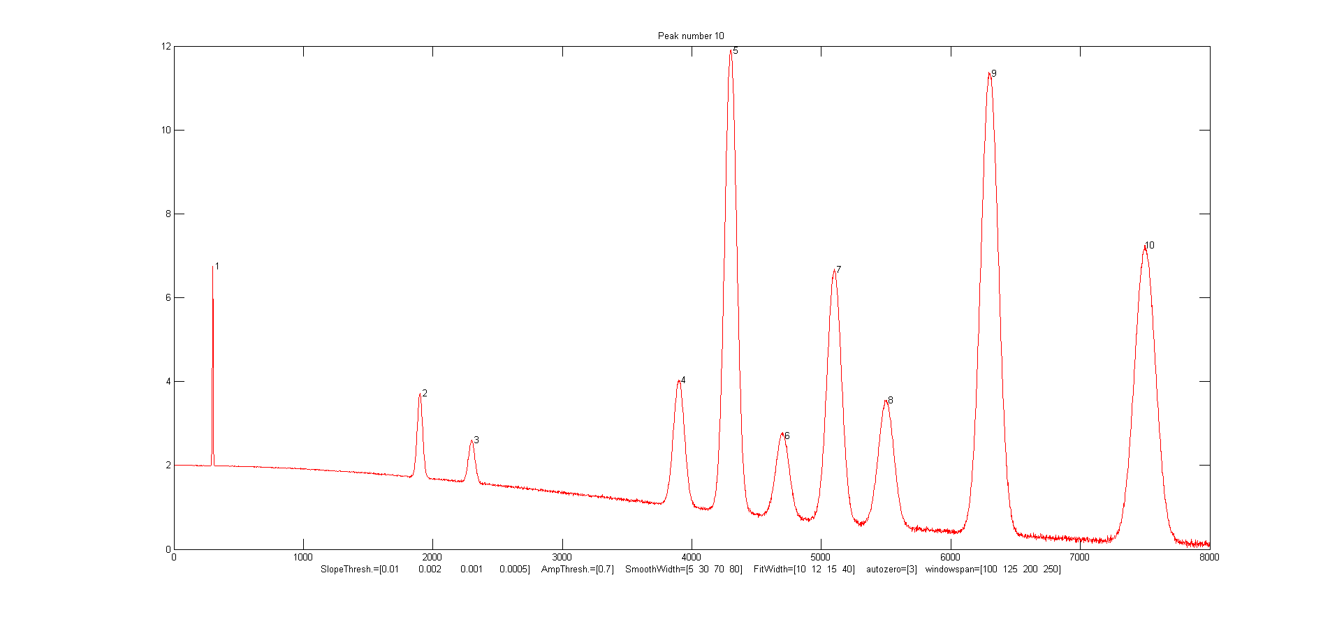 the first 10 peaks found, the x,y original unsmoothed data are
