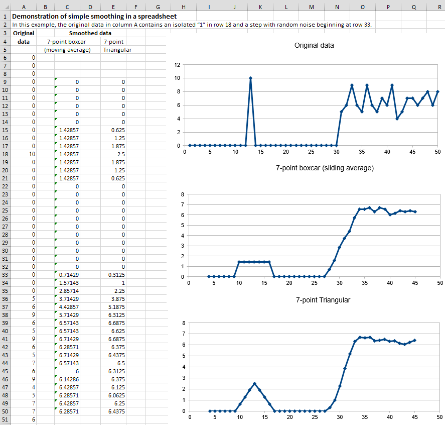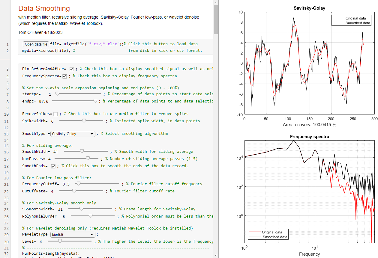 [Smoothing Algorithms] [Savitzky-Golay] [[Noise Reduction] [End Effects] [Examples] [The problem with smoothing] [Optimization] [When should you smooth a signal?] [When should you NOT smooth a signal?] [Dealing with spikes] [Video Demonstration] [Spreadsheets] [Matlab/Octave] [Live Script] [Interactive tools] [Have a question? Email me]